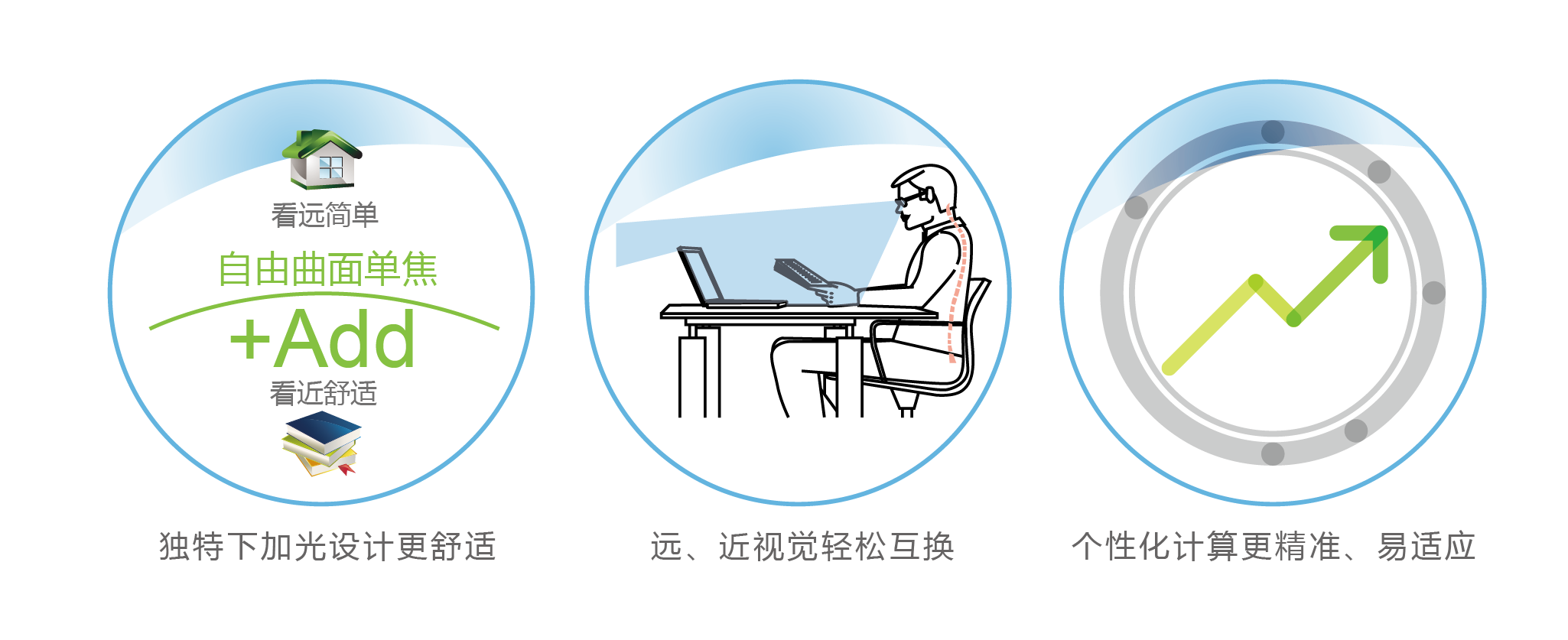 設計過程中,考慮學生近距離用眼時間長,上課時看近看遠切換頻率高,采用緩疲勞設計同時結合佩戴者瞳高、瞳距、鏡面彎、前傾角等個人參數進行個性化量身定制,能夠提高視覺清晰度和舒適度,遠近視覺自由調節,無跳像感,快速適應,看遠清晰,看近舒適。