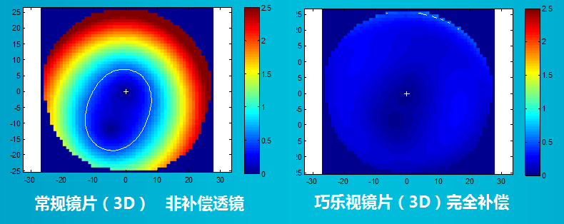 天潤兒童成長專用鏡片能通過“點像聚焦技術“,將周邊光線會聚到視網膜上。從而讓小孩的成像區域范圍更廣。(如圖,鏡片實際光度示意圖對比)