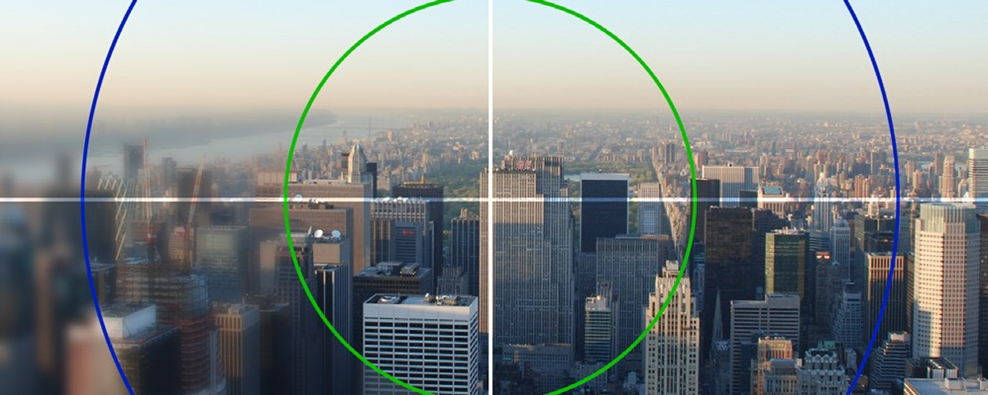 當佩戴者環顧四周時部分鏡片遠離光線中心或當鏡片傾斜時就會出現斜像差,斜像差會明顯影響成像區域的大小,即佩戴者視野變小。