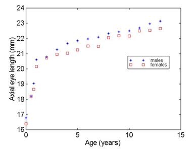數據來源:(: Larsen J.S., “The sagittal growth ofthe eye: IV Ultrasonic measurement of the axial length of the eye from birth topuberty” Acta Ophthalmol., 49, 873-886 (1971))