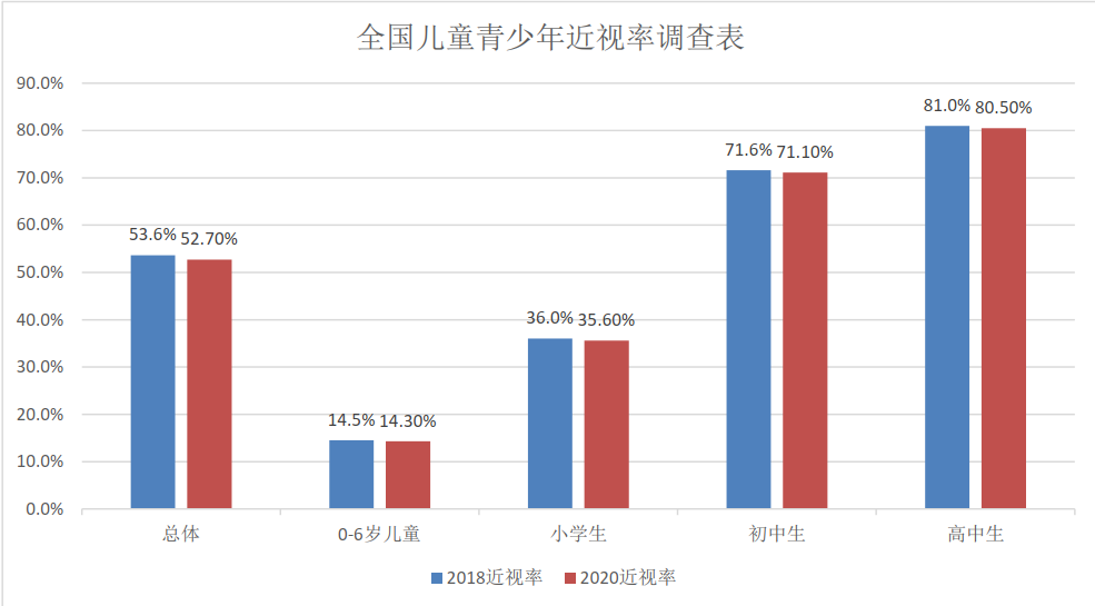 當前兒童青少年近視,已成為中國視力損傷的主要原因,兒童青少年視力健康已成為社會廣泛熱議話題。據近年國家衛健委對全國兒童青少年近視率調查統計顯示,2020年兒童青少年總體近視率較2018年有所降低,但是我們青少年近視率仍然呈現低齡化、普遍化的現狀。