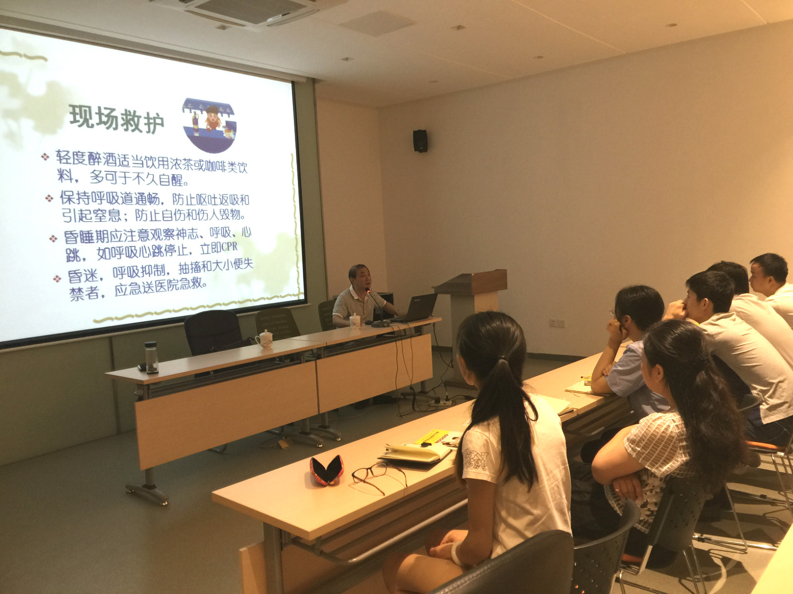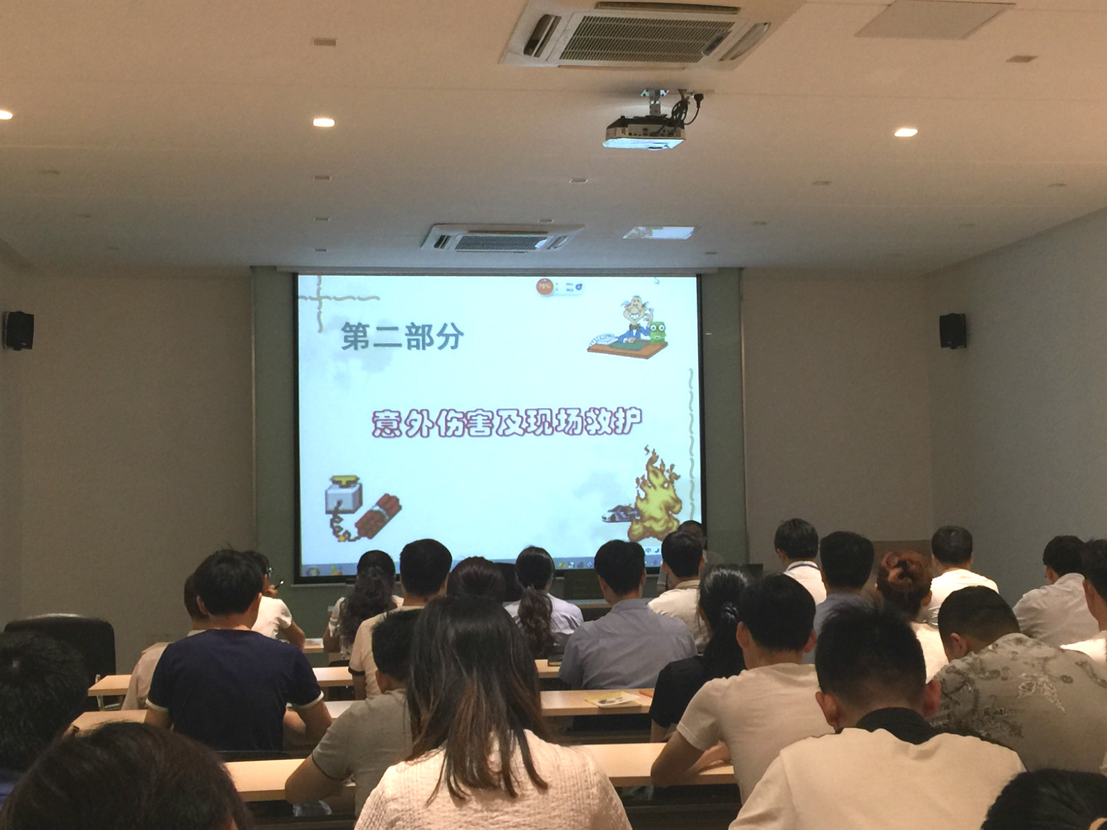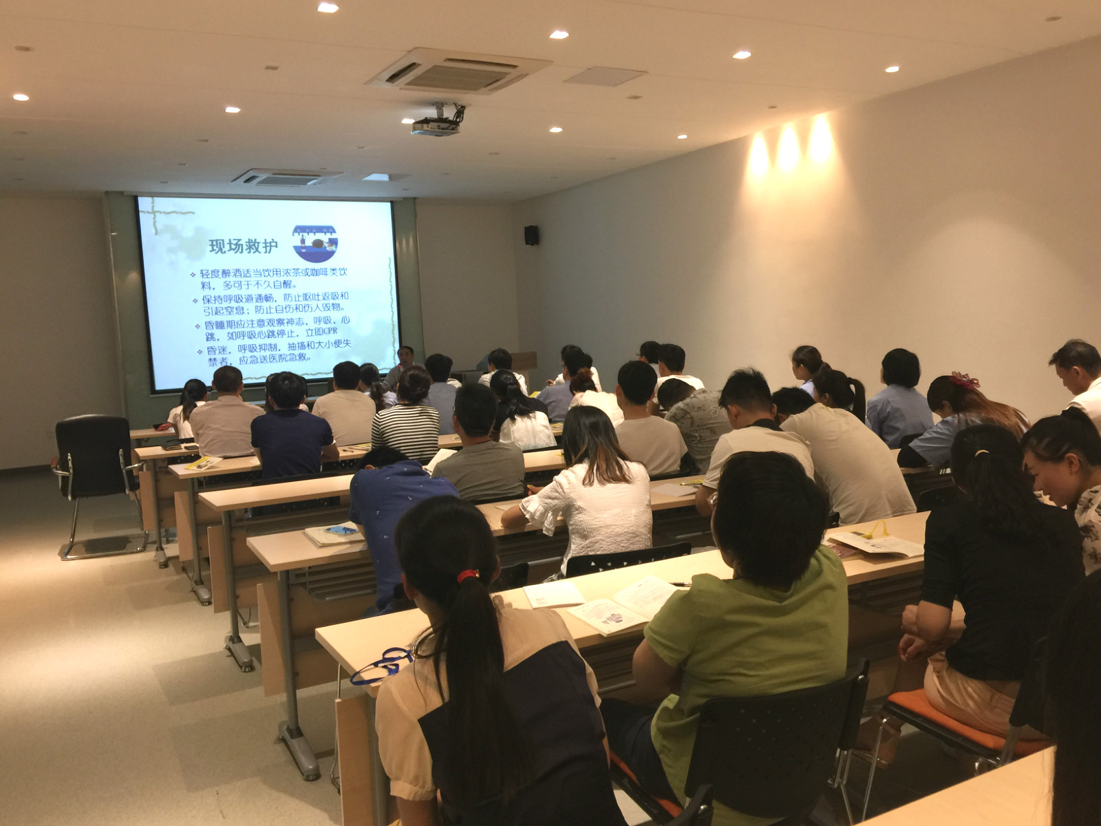 培訓(xùn)現(xiàn)場 紅十字會領(lǐng)導(dǎo)給我們一一列舉了再遇到淹溺、觸電事故、交通事故、地震、火災(zāi)、食物中毒等不可預(yù)估的事故時,應(yīng)當(dāng)如何進行現(xiàn)場救援和救護。