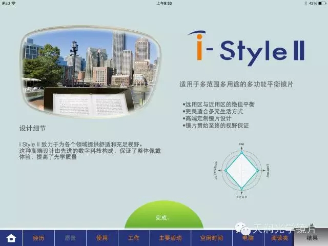I-style設計是為每一位佩戴者單獨設計,單獨生產的產品。它是需要通過一個程序系統了解客戶每天的活動及頻率,根據這些調查結果智能計算出遠近視野分配情況,以及邊緣象散的減緩方式,這些調整都是讓佩戴者能夠按照自身的實際需求來使用鏡片。該產品特別適合對尖端光學質量產品極致追求,愿意體驗不一樣生活方式的高端人群。
