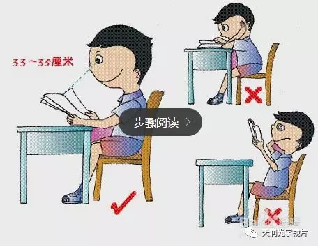 養成正確讀書寫字的姿勢,不要趴著、仰著或在光線昏暗的地方看書,眼睛離書本的距離保持在33-35厘米。