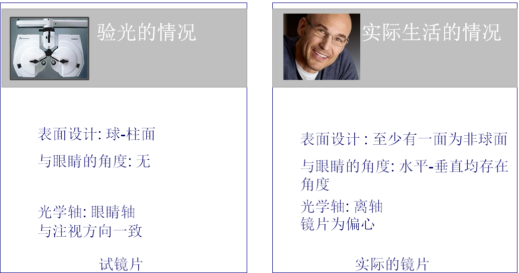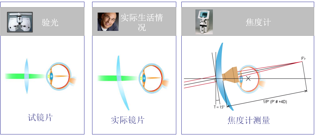在驗光過程中,按照驗光的度數配的眼鏡會使顧客產生佩戴不舒服的感覺,但用焦度計檢測時,發現鏡片光度是正確的,這就是實測光度和有效光度存在差異導致的.