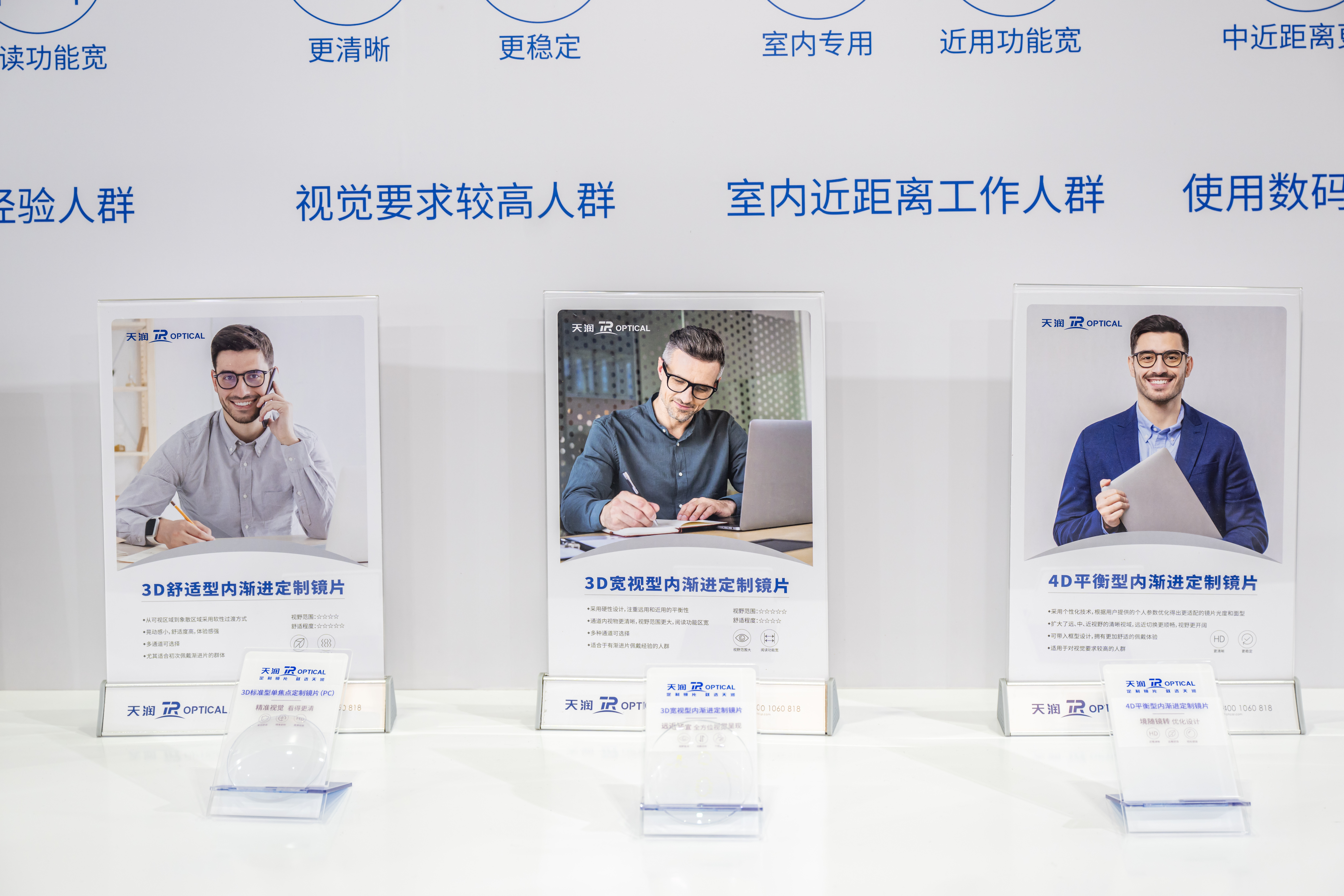 天潤光學作為個性化定制鏡片領域賽道的選手,針對中老年人群,擁有多元化\多功能\多場景3D、4D、5D、D+內漸進系列鏡片。