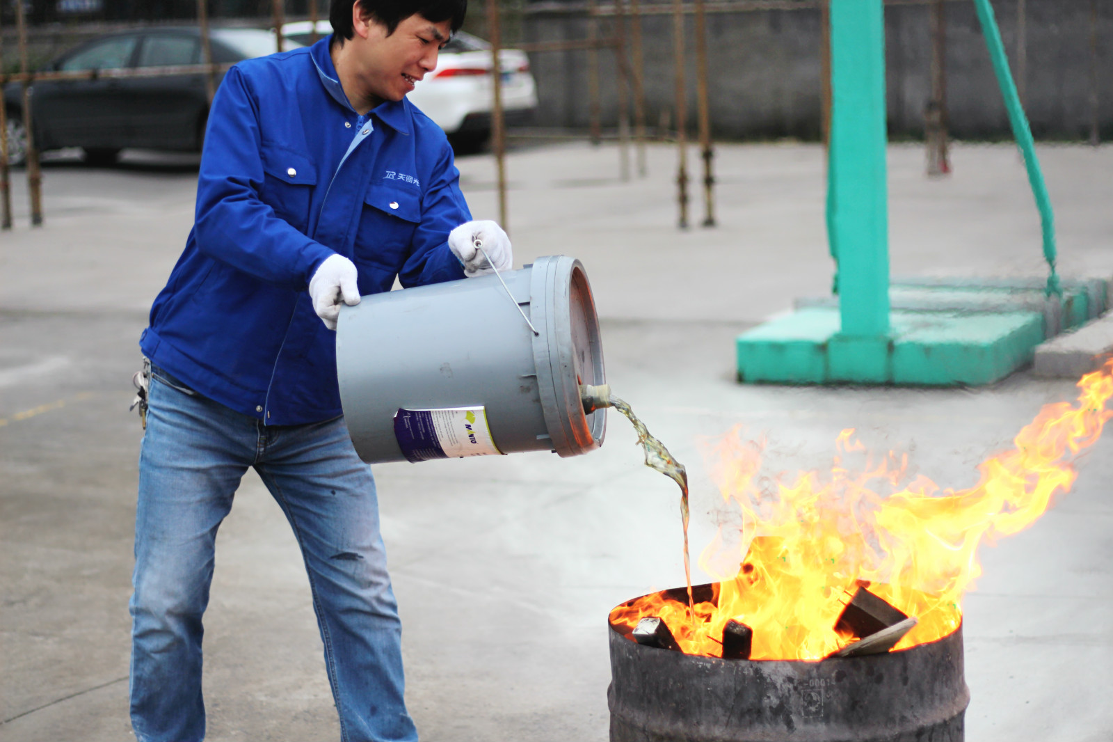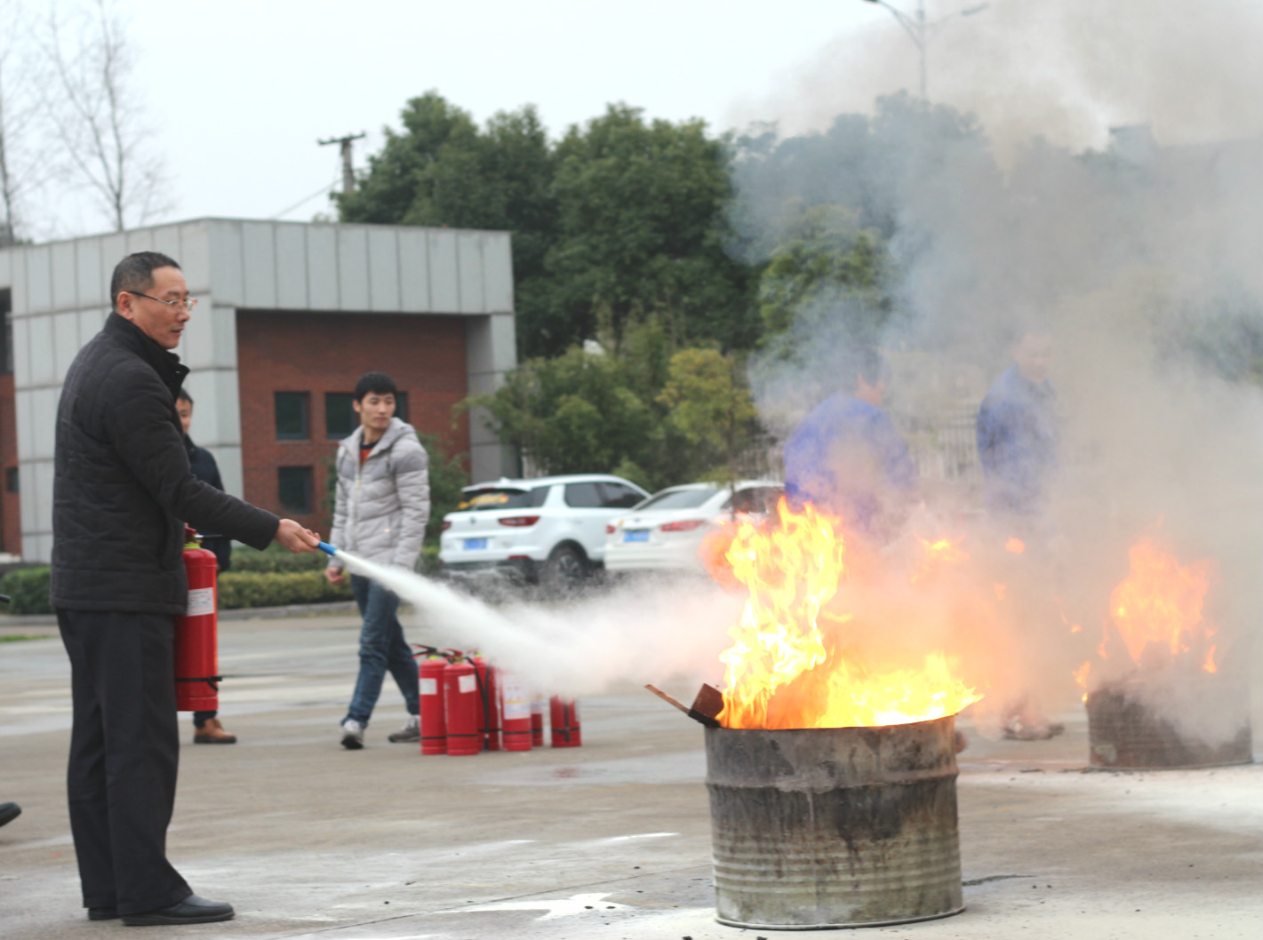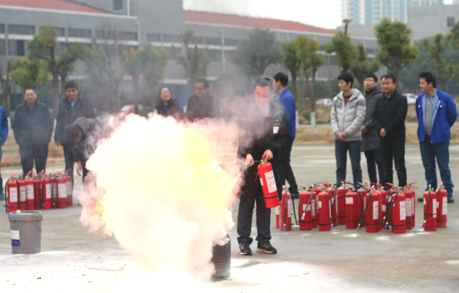 后勤人員正在廠區籃球場上擺放好滅火器和著火桶,萬事俱備只欠東風了。