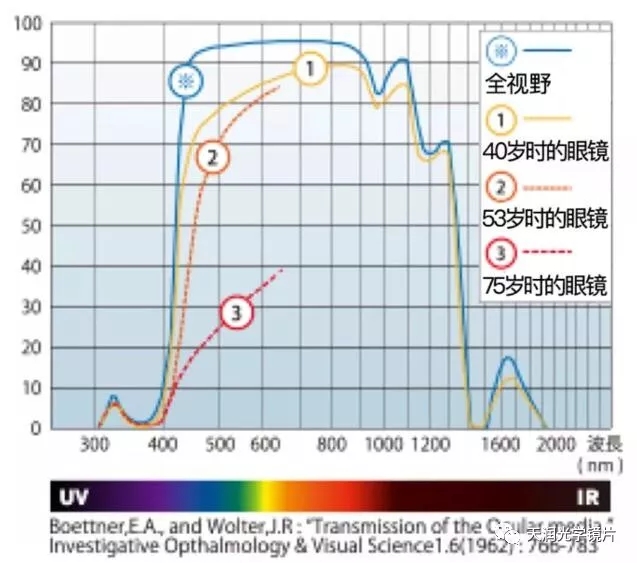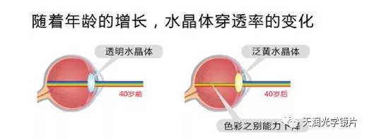 40歲以上人士的水晶體從透明漸變成綠色,甚至黃色,導致視野畫面質量大幅度下降。正是眾多中年人感到光線刺眼的原因。