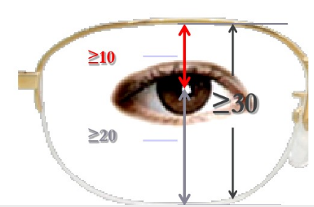 前傾角10-15mm,鏡距12mm,漸進通道長為18mm時,適應的瞳高應至少為120mm。鏡架上下框緣應≥30mm,以保證足夠有有效的可視區。