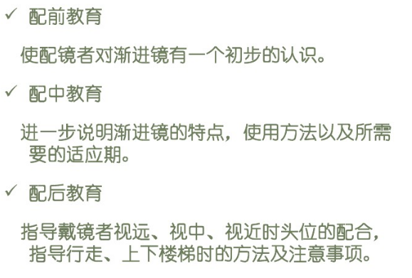 初戴漸進多焦點眼鏡需逐漸適應,應先靜后動,先室內后室外。適應期一般在一周左右,有的數分鐘或數小時即能適應。一般來說,知識分子適應比較快,年輕人比老年人適應快,戴過漸進多焦點眼鏡的比初戴者適應快。