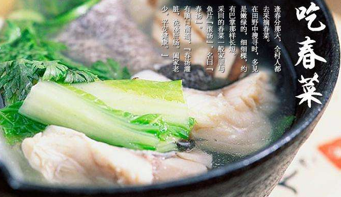 “春菜”是一種野莧菜,鄉人稱之為“春碧蒿”。逢春分那天,全村人都去采摘春菜。在田野中搜尋時,多見是嫩綠的,細細棵,約有巴掌那樣長短。采回的春菜一般家里與魚片“滾湯”,名曰“春湯”。