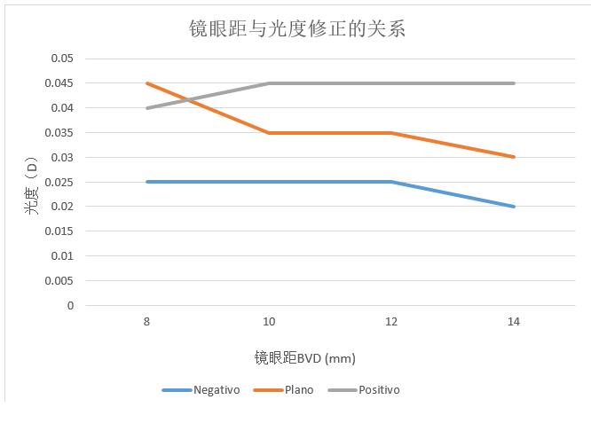 從上圖可知,當(dāng)鏡眼距在10-12mm之間,無論是負(fù)鏡、平光還是正鏡,其光度補(bǔ)償幾乎是趨于穩(wěn)定的。而只有特殊的鏡眼距,其光度補(bǔ)償?shù)姆炔鸥笠恍?。同時(shí),在某一個(gè)固定的鏡眼距上,就光度的修正值而言,正鏡比負(fù)鏡偏大。