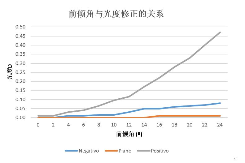 從該圖可以看出:平光的時(shí)候,前傾角的變化對(duì)光度修正影響較小,而對(duì)正鏡和負(fù)鏡的光度影響較為為明顯。尤其是正鏡中,前傾角的變化對(duì)光度修正有著較大的正相關(guān)性。