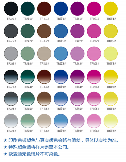 TR品牌太陽片系列含有染色鏡片系列和炫彩膜系列、偏光鏡片系列、歐麥迪NXT系列。
