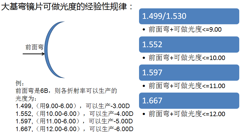 如一般-3.00度的鏡片會采用200BC的毛坯生產(chǎn),但為了匹配太陽鏡上所需彎度,需用6B或8B生產(chǎn),則稱之為大基彎鏡片