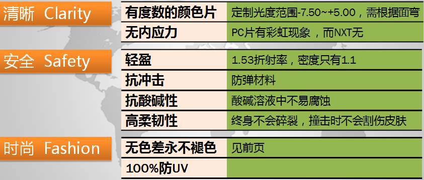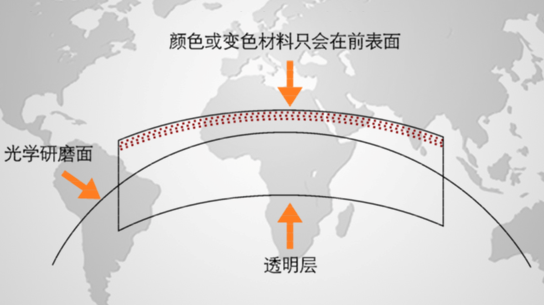 有賴于突破性的INTERCAST注色技術(shù)TM(全視線技術(shù) 專利產(chǎn)品)生產(chǎn)方法的開發(fā),將顏色注入原材料內(nèi),顏色及變色材料部分只加注于鏡片前表面(顏色部分厚度少于0.9mm),令鏡片無色差,不褪色。