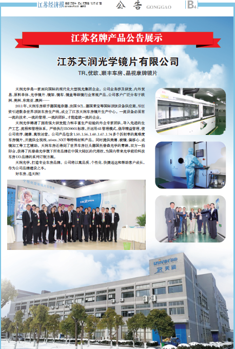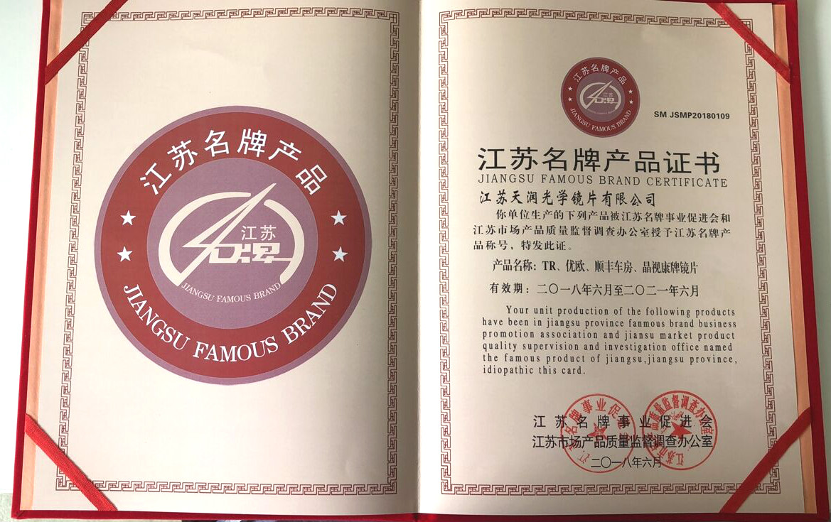 根據《江蘇名牌管理辦法》規定,由江蘇省質量技術監督局指導,江蘇名牌事業促進會、江蘇市場產品質量監督調查辦公室等權威機構聯合組織評審小組,對全省數干家申報企業在質量管理、科技創新、行業競爭力、企業信譽、社會責任等指標進行綜合評判,并對經營中存在重大信用問題的企業一票否決,江蘇天潤光學鏡片有限公司旗下的“TR、優歐、順風車房、晶視康”4大品牌通過審核,已被確認為2018年度江蘇名牌產品。