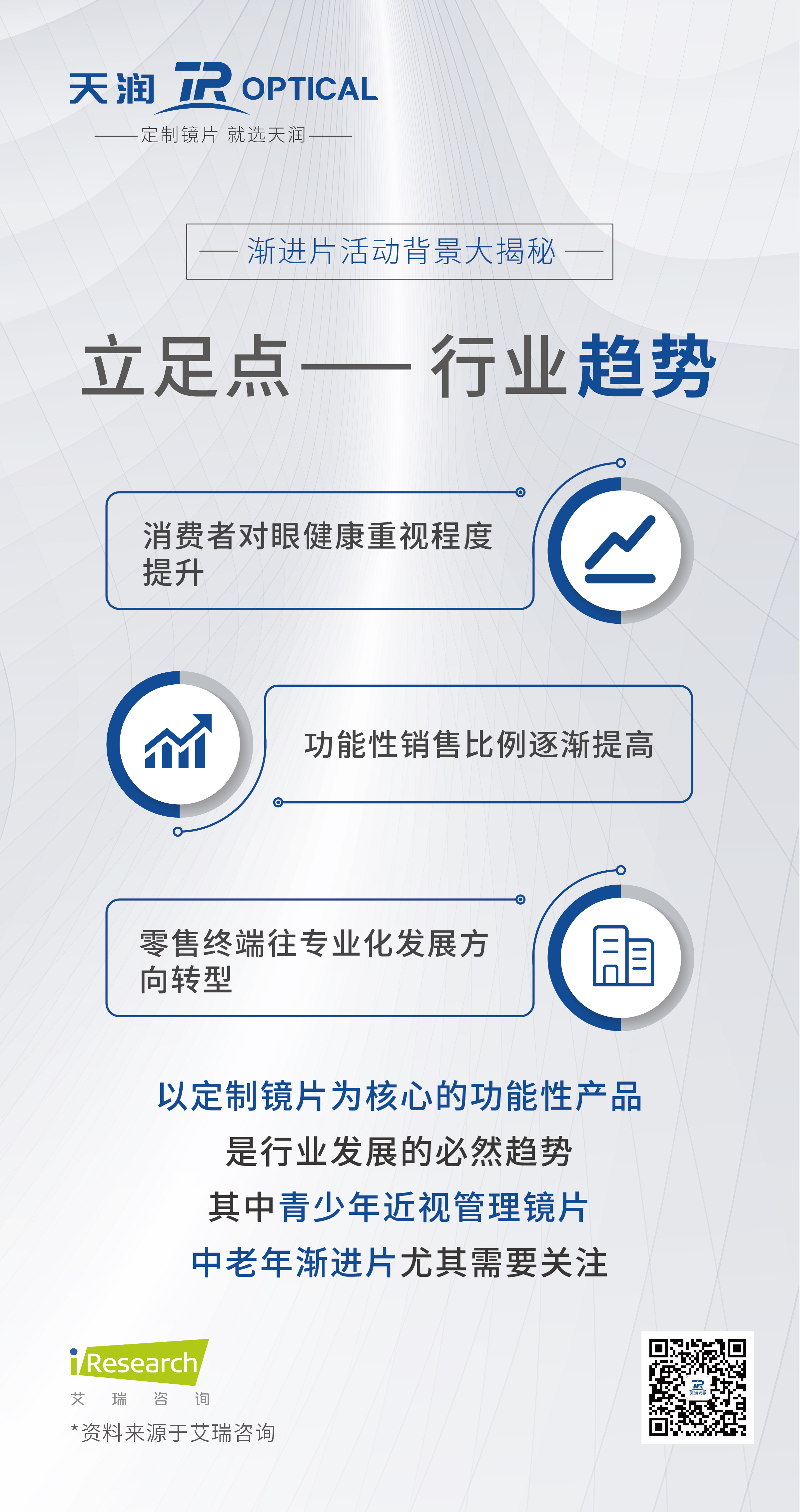 根據(jù)艾瑞咨詢發(fā)布的《2020年中國眼鏡鏡片行業(yè)白皮書》顯示(以下簡稱白皮書)消費者對眼健康重視程度提升 ,功能性銷售比例逐漸提高,零售終端往專業(yè)化發(fā)展方向轉(zhuǎn)型。市場導(dǎo)向原則,功能性產(chǎn)品為主的漸進產(chǎn)品是行業(yè)發(fā)展的必然趨勢。