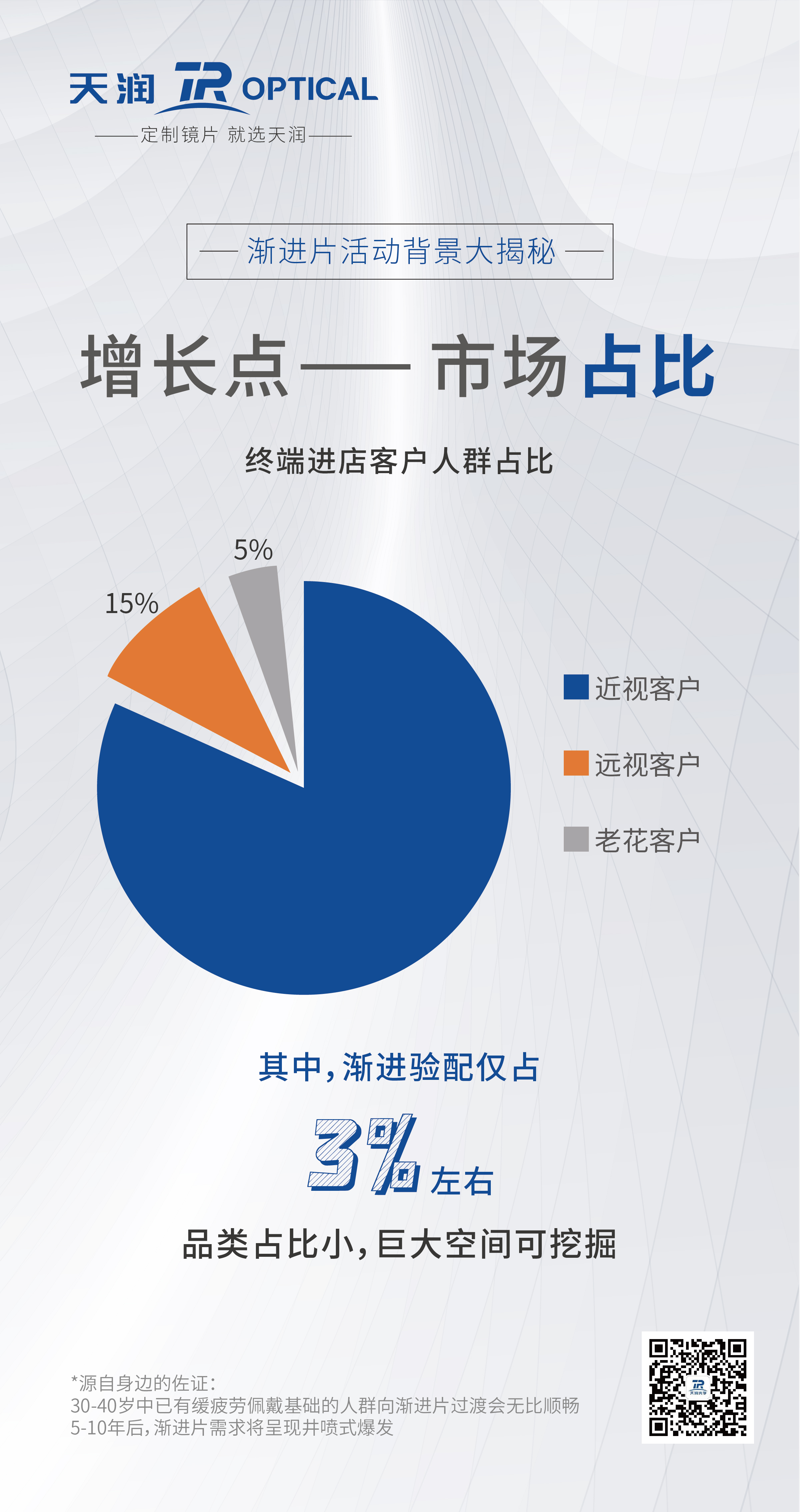 據(jù)資料顯示,終端零售門店進店客戶人群中,老花客戶約占5%,這其中老花客戶漸進購買比例僅占3%!品類占比小,漸進片品類存在不可估量的空間。