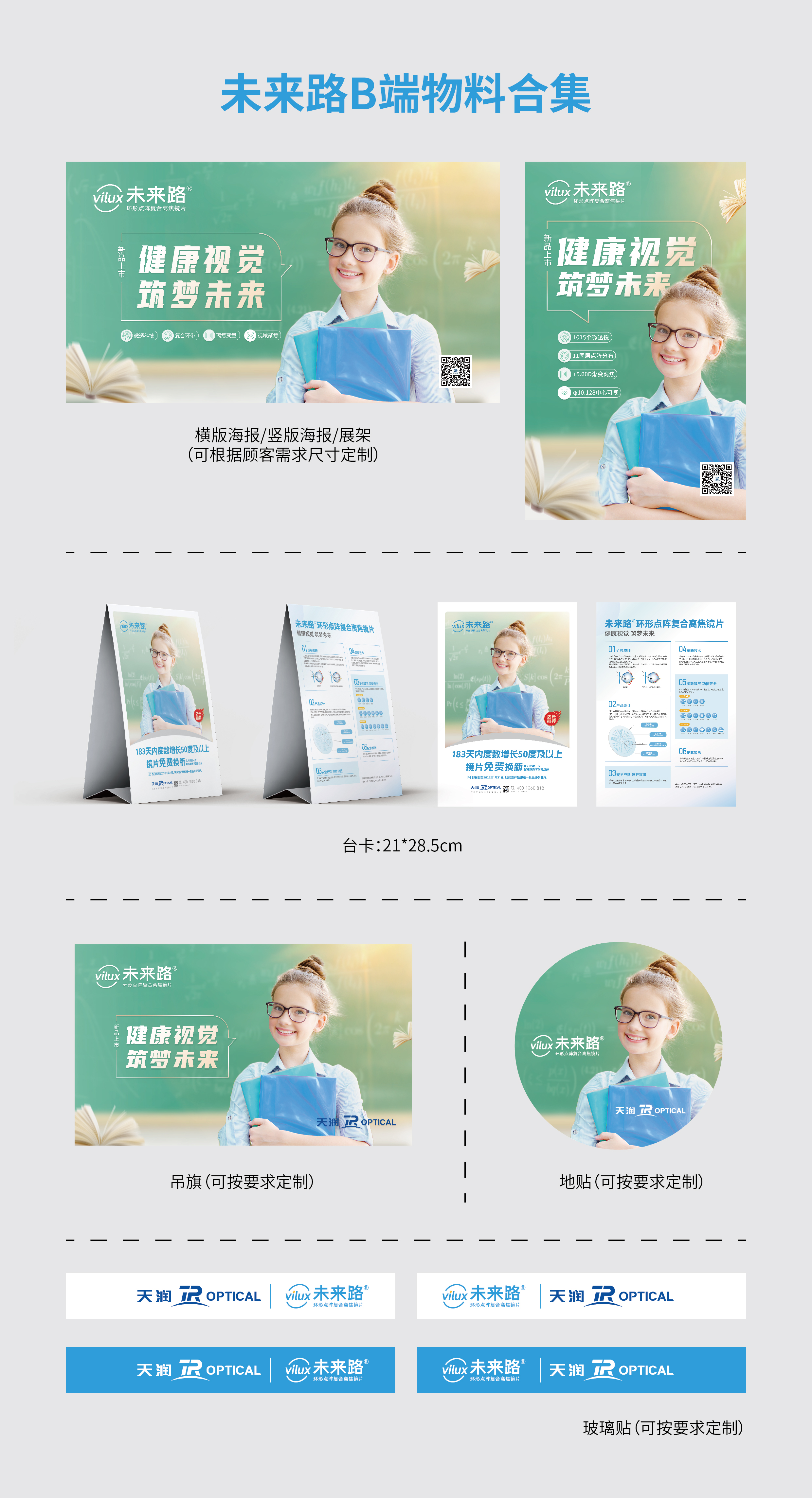 為了提升客戶滿意度,協(xié)助零售終端門店更好的銷售未來(lái)路?環(huán)形點(diǎn)陣復(fù)合離焦鏡片。新品上市期間,天潤(rùn)光學(xué)提供未來(lái)路?產(chǎn)品價(jià)格單頁(yè)、臺(tái)卡輔助銷售物料,同時(shí)可依據(jù)客戶需求設(shè)計(jì)海報(bào)、展架、吊旗、地貼、玻璃貼等定制物料。