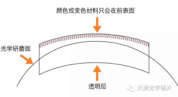 有賴于突破性的INTERCAST注色技術TM(全視線技術 專利產品)生產方法的開發,將顏色注入原材料內,顏色及變色材料部分只加注于鏡片前表面(顏色部分厚度少于0.9mm),令鏡片無色差,不褪色。