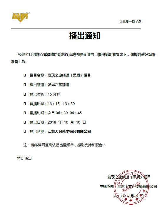 天潤光學紀錄片將于2018年10月10日周三下午1點15分至1點30分,在CCTV發現之旅頻道首播,次日6點30到6點45分重播!