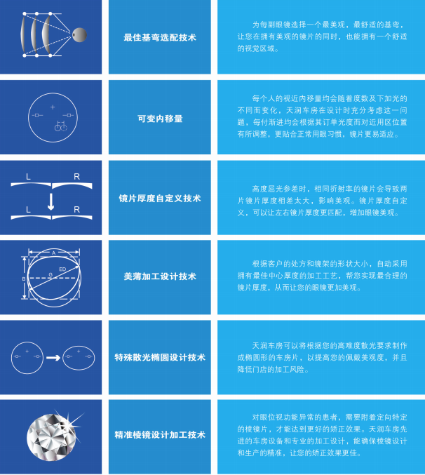 TR品牌還擁有最佳基彎選配技術、可變內移量、鏡片厚度自定義技術、美薄加工設計技術、特殊散光橢圓設計技術和精準棱鏡設計加工技術等特殊工藝,可以根據客戶訂單及要求為客戶采用特殊工藝提供專業高端定制鏡片。