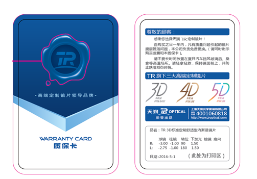 TR品牌采用全新包裝,按訂單類別分為3D、4D、5D不同包裝,并且每付訂單都含有天潤質保卡,承若在一年之內,凡有質量問題引起的鏡片膜層脫落問題,天潤公司負責免費更換,同時每張質保卡后面打印客戶訂單詳細情況。