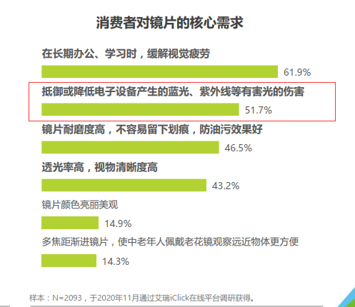 權(quán)威機(jī)構(gòu)艾瑞咨詢發(fā)表的《2020年中國(guó)眼鏡鏡片行業(yè)白皮書》一文中消費(fèi)者對(duì)鏡片的核心需求在抵御或降低電子設(shè)備產(chǎn)生的藍(lán)光、紫外線等有害光的傷害這一具象要求上占比高達(dá)51.7%,在零售終端實(shí)際銷售中藍(lán)光防護(hù)鏡片成為消費(fèi)者點(diǎn)單率越來(lái)越高的單品之一,功能性鏡片受市場(chǎng)青睞的程度將會(huì)越來(lái)越高,防藍(lán)光鏡片市場(chǎng)也成為眾多商家的必爭(zhēng)之地。