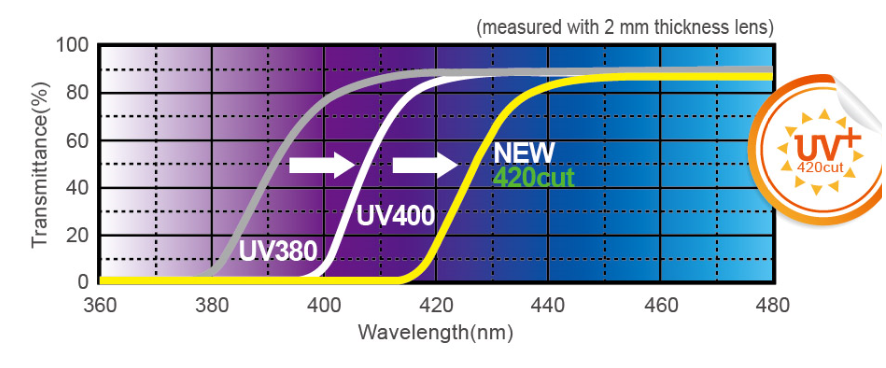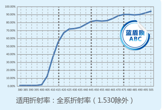 2、從鏡片內(nèi)部對(duì)光線進(jìn)行合理有效區(qū)分。除紫外線以外,能濾除420nm附近的高能有害藍(lán)光,阻隔率高。