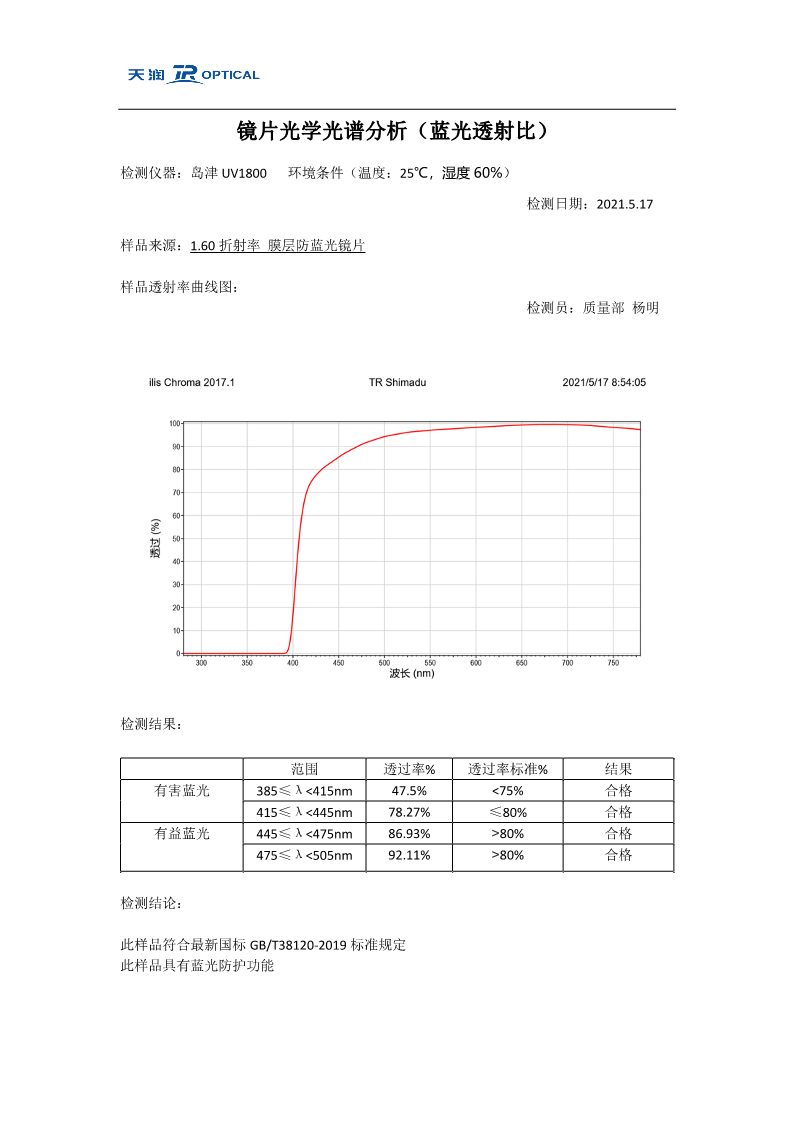 隨機(jī)抽取天潤(rùn)光學(xué)實(shí)時(shí)車房生產(chǎn)線上的產(chǎn)品進(jìn)行數(shù)據(jù)檢測(cè),通過(guò)儀器檢測(cè)分析該樣品每個(gè)波段的透射率,得出有害藍(lán)光和有益藍(lán)光波段的透射率都在新國(guó)標(biāo)要求范圍內(nèi)。
