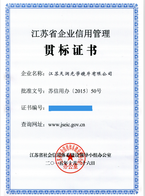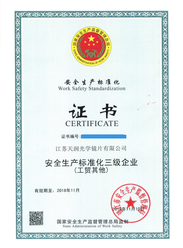 熱烈慶祝天潤光學(xué)榮獲國家安全生產(chǎn)標(biāo)準(zhǔn)化三級企業(yè)證書和江蘇省企業(yè)信用管理貫標(biāo)證書。