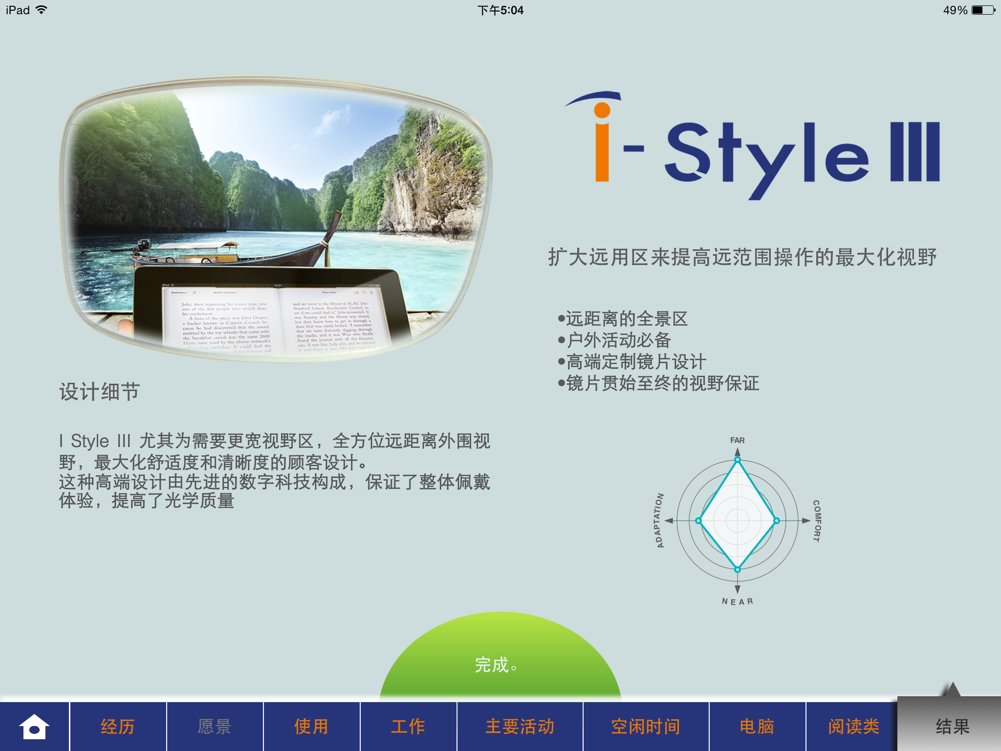 該軟件對客戶的8個問題的答案進行統計,從4個維度為佩戴者推薦最合適的產品,分別是遠用區、近用區、舒適度與適用性。