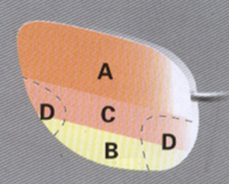 D區,鏡片兩側的D區,是度數變化區域,通過該區域看東西會感到模糊,但會隨著使用過程中的適應程度而逐漸改善。